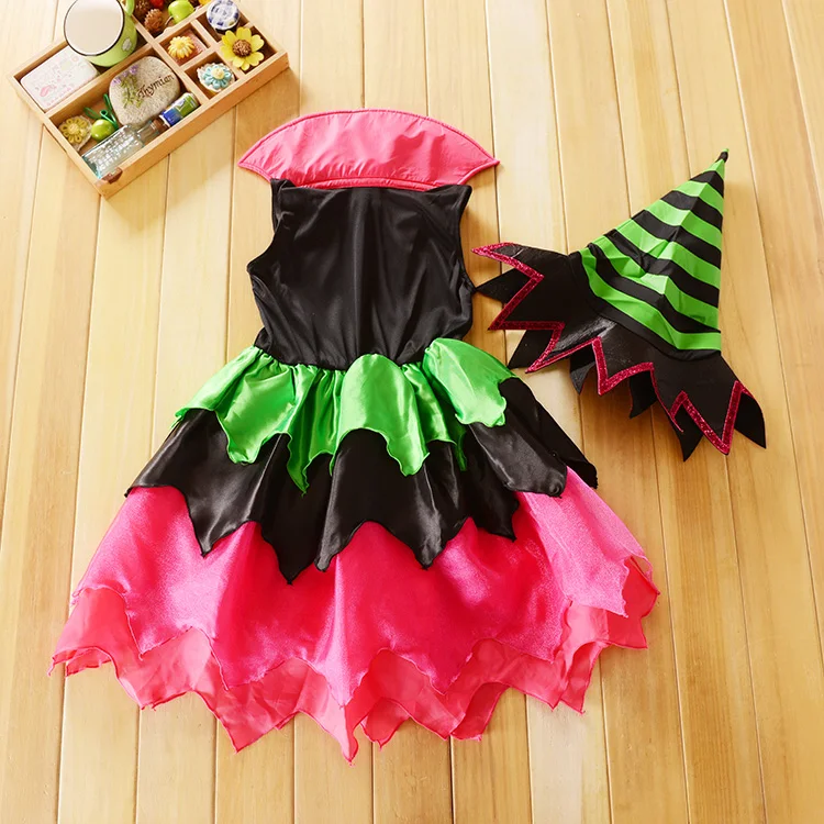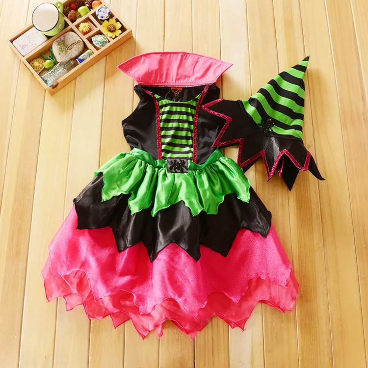 Review kids Halloween Witch costume girls patchwork ruffles striped character actor clotings Christmas Dra